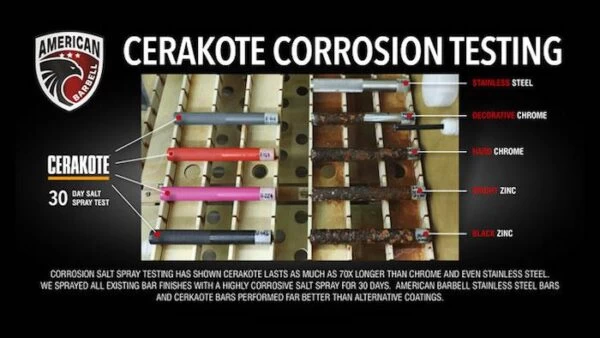 After many years of producing some of the finest Olympic barbells in the world, American Barbell is proud to introduce our latest innovation: Cerakote finished bars. Nothing ever produced rivals the corrosion and abrasion resistance of this finish. Cerakote is used by major firearm manufacturers around the world in some of the most abusive and corrosive environments. Corrosion salt spray testing has shown that this coating lasts as much as 70x longer than chrome and even stainless steel.