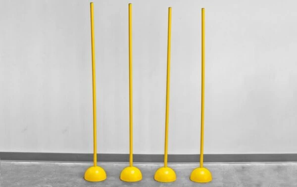 The tall poles force the athlete to keep the upper body over the hips, eliminating poor posture. Pole height is 5′. Bases can be sand filled for stability. Includes four bases and four poles. Versatile item that can be combined with rope and streamers to mark simple boundary lines.