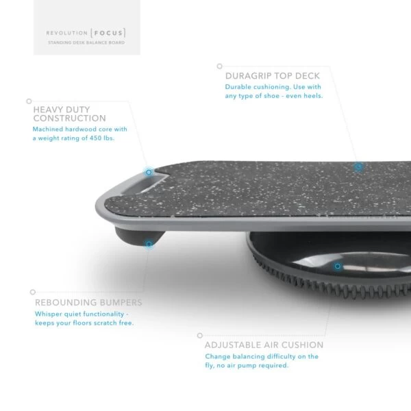 The Revolution Focus Balance Board is designed to maximize your standing-while-working experience by further engaging your body and your mind. Standing desks are becoming more and more popular these days, and for good reason: many studies have shown it can improve your overall health.