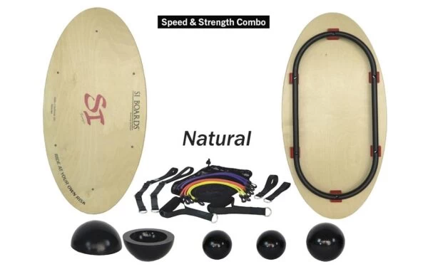 Made in the USA, Si Boards are designed with a unique steel rail system positioned underneath the 36″ x 18″ wood balance board, enabling multiple customization options for changing the difficulty level and speed of movement. There are two combo packs available for adding compatible urethane balance balls and other board accessories.