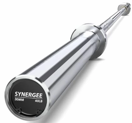 The Synergee Essential Barbell is a low-cost bar ideal for beginners or those who need a barbell for simple movements. It is priced under $200, features dual knurling markings, and is rated at 110K PSI.